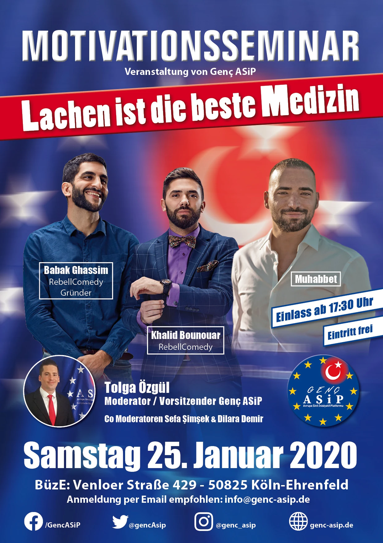 Der Bundesvorsitzende von Genç ASIP - Junge Europäische Bürgerinitiative Plattform Tolga Özgül organisierte am Samstag den 25. Januar 2020 im Bürgerzentrum Ehrenfeld, Venloer Str. 429, 50825 Köln-Ehrenfeld, ein Motivationsseminar mit verschiedenen Künstlern. Anlässlich des Motivationsseminars mit den Künstlern von Rebellcomedy: Babak Ghassim, Khalid Bounouar, und dem Sänger Muhabbet,